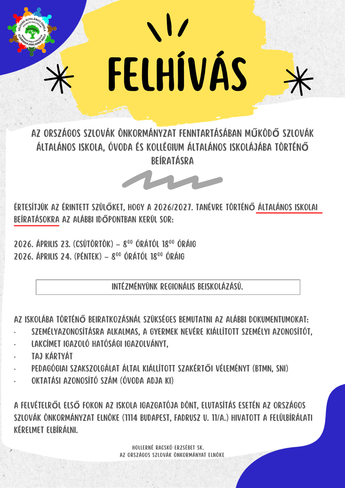 FELHÍVÁS ISKOLAI BEÍRATÁSRA